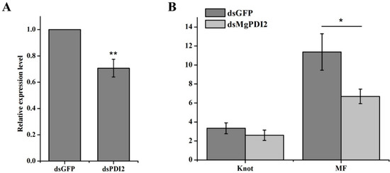 To analyze whether MgPDI2 plays a role in M. graminicola parasitism, in vitro RNAi of MgPDI2 was performed. The qRT-PCR (Figure 5A) results showed a decrease in the transcript abundance of MgPDI2 in the J2s that were soaked with MgPDI2 dsRNA. Then, rice roots were infected by J2s that were soaked in dsRNA targeting MgPDI2 or GFP and the nematode multiplication factor (MF) ((number of egg masses × number of eggs per egg mass) ÷ nematode inoculum level = MF) at 15 dpi was determined. Our analysis showed that the MF was reduced significantly in plants infected with juveniles treated with dsRNA against MgPDI2 (MF = 6.69) compared to GFP (MF = 11.37) (Figure 5B).