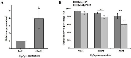 qRT-PCR was used to analyze the expression of MgPDI2 in response to H2O2. A significant increase in transcript abundance of MgPDI2 was found in juveniles that were exposed to 40 mM H2O2 compared to 0 mM H2O2 for 30 min (Figure 6A). We examined the mortality rate of MgPDI2 or GFP dsRNA-treated J2s after soaking them in different concentrations (0, 20, 40 mM) of H2O2 (Figure 6B). We found that a significantly lower percentage of J2s with silenced MgPDI2 survived after exposure to 20 mM and 40 mM H2O2 compared to GFP-silenced controls.