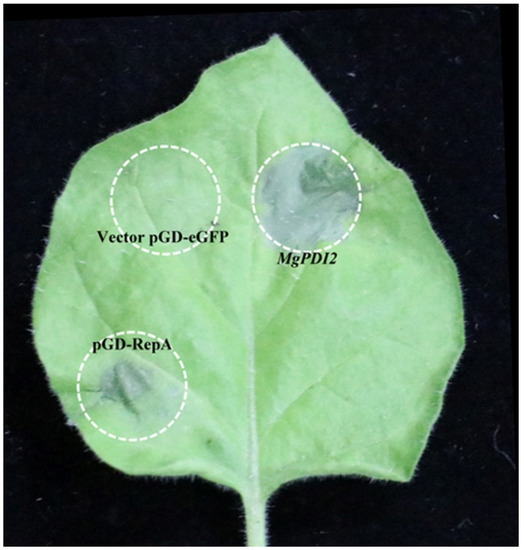 Transient expression of MgPDI2 induces cell death in N. benthamiana. Infiltration of Agrobacterium tumefaciens strain EHA 105 carrying a MgPDI2 expression construct into leaves of 6-week-old N. benthamiana plants. Empty pGD-eGFP vector was used as a negative control, while pGD-RepA was used as a positive control.