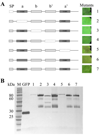 Determination of MgPDI2 domains required for cell death induction. (A) Schematic views of MgPDI2 and deletion mutants are shown on the left. The deletion mutants of MgPDI2 were transiently expressed in N. benthamiana leaves. (B) Western blot analysis of the MgPDI2 deletion series. The anti-GFP primary antibody was used to detect the accumulation of fused proteins in the leaves of N. benthamiana plants. 1: signal peptide deletion mutant; 2: “a” deletion mutant; 3: “b” deletion mutant; 4: “b′” deletion mutant; 5: “a′” deletion mutant; 6: CGHC in domain “a” deletion mutant; 7: CGHC in domain “a” replaced by AAAA mutant. The ladder used as size standards for the gel consists of the following molecular weight bands: 250, 150, 100, 80, 60, 50, 40, 30, 25, 20, 15, and 10 kDa. The presence of numerous bands might be due to the poor antibody specificity.