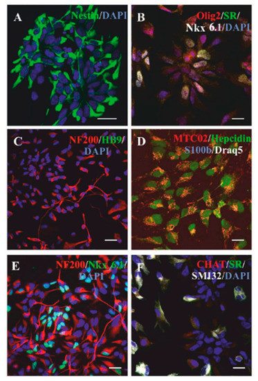 Neural progenitors derived from induced pluripotent cells (NP-iPS) in vitro characteristics. Immunostaining shows that NP-iPS cultures that were used for transplantation at the starting point of differentiation (contained nestin- (A), Olig2-, serotonin-(SR), and Nkx6.1-positive cells (B). At day 0, NP-iPS cultures were NF200-positive, but they did not express a motoneuron (MN)-specific marker HB9 (C). All NP-iPS were positively stained with human mitochondria (MTC02) and expressed a hepcidin (D), but they were S100β-negative (D). NF200 and Nkx6.1 co-staining revealed equal proportions of Nkx6.1-positive and Nkx6.1-negative cells in cultures (E). NP-IPS cultures did not contain acetylcholine transferase (CHAT)-positive cells, and only few cells were SMI32-positive (F). Scale bars = 20 µm.