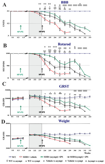 Taken together, our results show that NP-iPS cells transplanted into SOD-1 rats can surround motoneurons, protect them from degeneration, and preserve motor function. Their effects include the upregulation of neurotrophins and preservation of the ECM and particularly the PNNs. Our findings confirm that stem cell and progenitor therapy can modify the progression of neurodegenerative pathology. This might be combined with drugs that stop the loss of PNN or block the interaction of MIF with its known receptor (CD74) for a therapeutic strategy to treat ALS and other neurodegenerative diseases [64,65,66]. However, our results did not confirm the differentiation into any desired mature neuronal phenotype, and thus, the effect of NP-iPS is most likely paracrine and does not differ from the effects of non-neural stem cell applications such as MSCs.
