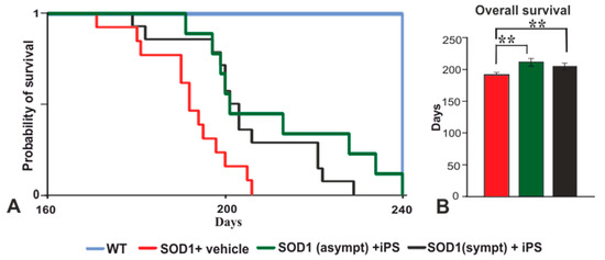 Animal survival. Kaplan–Meier plot describes the cumulative probability of animals’ survival in tested Tg and WT groups (A). NP-iPS cell therapy significantly extended the survival of both cell-transplanted groups (B). Differences in the groups were analyzed by one-way ANOVA, p < 0.01 (**).