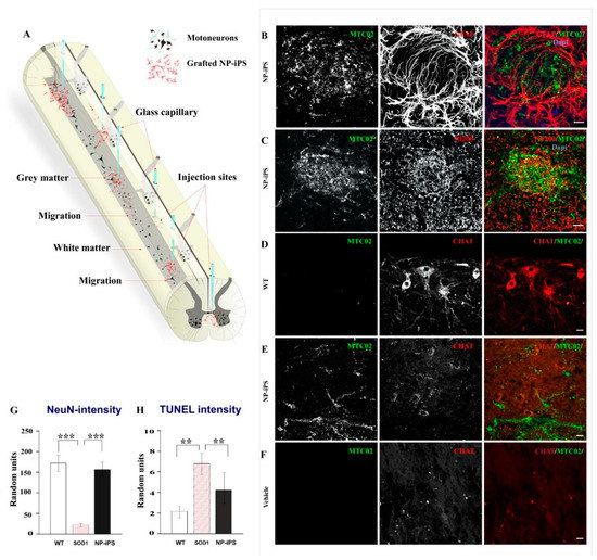 Survival and engraftment of NP-iPS. Schematic diagram shows a map of intraspinal injection sites (via the glass capillary tubes) and distribution of the grafted cells within the spinal cord (A). Intraspinally transplanted NP-iPS engrafted into the host tissue at the site of injection (B), Engrafted cells also preserved the expression of host neurofilament (C). Compared to WT rats (D), cell-treated animals (E) had weaker acetylcholine transferase (CHAT) staining, even though NP-iPS engrafted in the close vicinity to host MNs (E); however, NP-iPS-treated rats still maintained CHAT-positive cells (E) compared with vehicle-treated animals, where the CHAT staining was almost undetectable (F). A neuroprotective effect evaluated by NeuN fluorescence intensity revealed a significantly higher fluorescence in the ventral horns of NP-iPS-treated superoxide dismutase (SOD1)-rats compared with the vehicle-treated SOD1 littermates (G). TUNEL staining confirmed less apoptosis in NP-iPS-treated SOD1-rats compared with the vehicle-treated SOD1 littermates (H). Cell nuclei were visualized with 4′,6-diamidino-2-phenylindole (DAPI) staining. Differences in the groups were analyzed by one-way ANOVA, p < 0.01 (**), p < 0.001 (***). Scale bars = 20 µm.