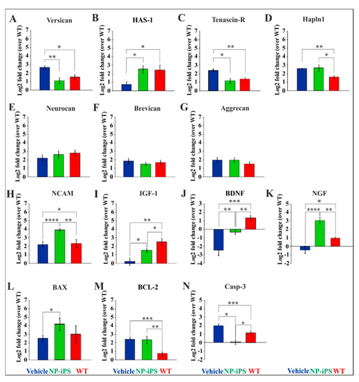 NP-iPS transplantation normalized the altered expression of spinal host genes. Seven PNN-related molecules of the ECM were tested. Vehicle-treated SOD1 rats had a significant dysregulation of versican (A), has-1 (B), tenascin-R (C), and hapln1 (D), which were recovered by NP-iPS transplantation. On the other hand, neurocan (E), brevican (F), and aggrecan (G) expression did not vary between the groups. Similarly, a significant dysregulation of genes encoding ncam (H) and growth factors igf-1 (I), bdnf (J), and ngf (K) was amended by NP-iPS. Cell-treated rats had significantly upregulated bax compared to vehicle-treated littermates (L). Both vehicle and cell-treated animals have upregulated apoptosis-related gene bcl-2 (M), while caspase-3 (N) was downregulated by the delivery of NP-iPS (N). Bars represent the means ± SEM of the signal values assessed by the 2−ΔΔCt method normalized to two endogenous reference genes, which were recalculated to relative quantities and transformed to a log2 scale. Differences in the groups were analyzed by one-way ANOVA: statistical significance at p values under 0.05 (*), p < 0.01 (**), p < 0.001 (***) and p < 0.0001 (****).