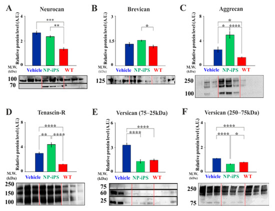Identification of PNN-related molecules contributing to the disorganized spinal PNN structure. Immunoblotting of gel filtration fractions for the presence of the spinal PNN-related ECM molecules identified the upregulation of neurocan (A), aggrecan (C), tenascin-R (D), and both versican fractions 75–25 kDa (E) and 250–75 kDa (F); as well as a normal amount of brevican (B) in SOD1 animals compared with WT controls. NP-iPS-treated rats showed significantly higher amounts of ECM molecules (A–D) than in WT, except for versican (E,F), whose levels remained similar to those observed in WT littermates. Differences in the groups were analyzed by one-way ANOVA: statistical significance at p values under 0.05 (*), p < 0.01 (**), p < 0.001 (***) and p < 0.0001 (****).