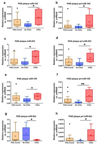 Levels of microRNAs (miRNAs) and their primary transcripts (pri-miRNAs) in the atherosclerotic plaques of peripheral artery disease (PAD) patients. Levels of miR-142 (a), miR-223 (c), miR-155 (e), miR-92a (g), pri-miR-142 (b), pri-miR-223 (d), pri-miR-155 (f), and pri-miR-92a (h) in the atherosclerotic plaques of PAD patients with cardiovascular events (CVEs) compared to those with no CVEs. Data are illustrated as boxplots with Tukey whiskers, median line, and mean cross (+). * p < 0.05, ** p < 0.01 vs. no CVEs.