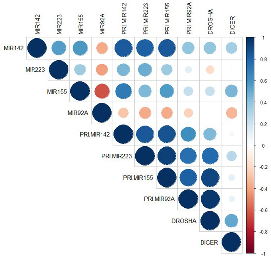 Bivariate correlations among miRNAs, pri-miRNAs, and mRNAs in the plaques of PAD patients were estimated by Spearman’s function and are illustrated in Figure 3 (given in detail in Table S1, Supplementary Materials). We found a strong positive correlation between miR-142 and pri-miR-142 expressions in femoral artery atheromas from PAD patients (R = 0.837, p = 3.53 × 10−4) and a good positive correlation between plaque miR-155 and pri-miR-155 (R = 0.566, p = 0.035) expressions. Plaque miR-142 expression strongly correlated with pri-miR-223 (R = 0.814, p = 7.02 × 10−4) and with pri-miR-155 (R = 0.843, p = 2.96 × 10−4) expression. A strong correlation between plaque miR-155 and pri-miR-142 expression was also observed (R = 0.705, p = 0.007). Very strong correlations were determined between mRNA Drosha in the plaques and pri-miRNAs: pri-miR-223 (R = 0.778, p = 3.9 × 10−4), pri-miR-92a (R = 0.965, p = 1.47 × 10−9), and pri-miR-155 (R = 0.912, p = 8.61 × 10−7).