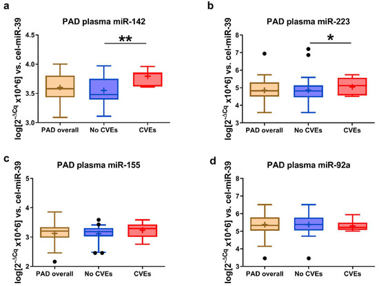 In the plasma of PAD patients with CVEs compared to those without CVEs, significantly higher levels of miR-142 (1.6-fold, p = 0.013) (Figure 4a) and miR-223 (2-fold, p = 0.05) (Figure 4b) were determined, while no significant differences were found for miR-155 and miR-92a (Figure 4c,d).