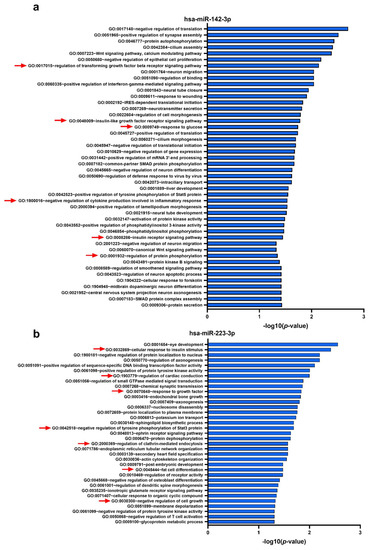 Database for Annotation, Visualization, and Integrated Discovery (DAVID) functional analysis for Gene Ontology (GO) biological processes associated with target genes identified by miRWalk algorithm to be potentially regulated by the selected microRNAs, i.e., miR-142-3p (a) and miR-223-3p (b). Selected GO biological process terms are indicated by red arrows.