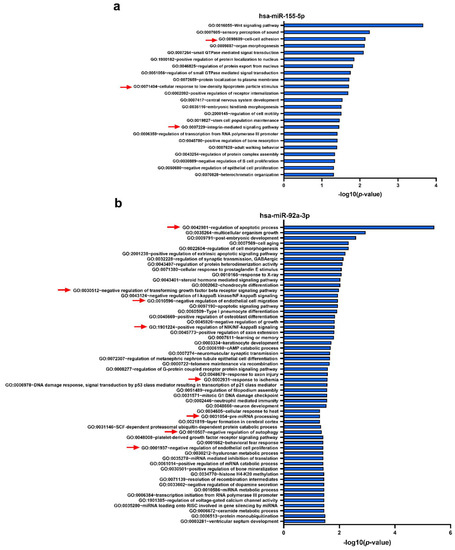 DAVID functional analysis for Gene Ontology (GO) biological processes associated with target genes identified by miRWalk algorithm to be potentially regulated by the selected microRNAs, i.e., miR-155-5p (a) and miR-92a-3p (b). Selected GO biological process terms are indicated by red arrows.