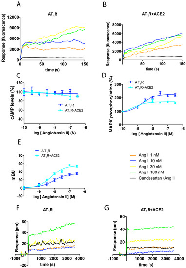 Impact of ACE2 on the functionality of AT1R. HEK-293T cells were transfected with either 0.4 µg AT1R cDNA and 0.2 µg ACE2-HA cDNA (A,B,F,G), 0.5 µg AT1R-YFP cDNA, 0.2 µg ACE2-HA cDNA, and 0.5 µg β-arrestin II-RLuc cDNA (C), or 0.4 µg AT1R cDNA, 0.2 µg ACE2-HA cDNA, and 0.5 µg cDNA encoding the Ca2+ sensor, GCaMP6 (D,E). After 48 h of incubation, cells were treated with increasing concentrations of the AT1R agonist, Ang II. Cyclic AMP was measured after 15 min in response to pre-treatment with 0.5 μM forskolin (A); as shown, this intervention resulted in approximately 4 nM cAMP, which corresponds to a 240% increase over baseline levels. Results from the evaluation of ERK1/2 phosphorylation (B), β-arrestin II recruitment (C) Ca2+ levels (D,E), and DMR recordings (F,G) are presented as dose-response curves. Where indicated, cells were pre-treated with the selective AT1R receptor antagonist, candesartan (1 µM), before challenge with the receptor agonist. Values shown are the mean ± SEM of 8 independent experiments each performed in triplicate.