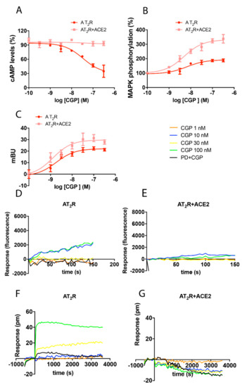 Impact of ACE2 on the functionality of AT2R. HEK-293T cells were transfected with either 0.3 µg AT2R cDNA and 0.2 µg ACE2-HA cDNA (A,B,F,G), 0.4 µg AT2R-YFP cDNA, 0.2 µg ACE2-HA cDNA, and 0.5 µg β-arrestin II-RLuc cDNA (C), or 0.3 µg AT2R cDNA, 0.2 µg ACE2-HA cDNA, and 0.5 µg cDNA encoding the Ca2+sensor, GCaMP6 (D,E). After 48 h of incubation, cells were treated with increasing concentrations of the selective AT2R agonist, CGP. Cyclic AMP was measured after 15 min in response to pre-treatment with 0.5 μM forskolin (A); see also Legend to Figure 1. Results from the evaluation of ERK1/2 phosphorylation (B), β-arrestin II recruitment (C), Ca2+ levels (D,E), and DMR recordings (F,G) are presented as dose-response curves. Where indicated, cells were pre-treated with selective AT2R receptor antagonist, PD123319 (PD; 1 µM), before challenge with the receptor agonist. Values are the mean ± SEM of 8 independent experiments each performed in triplicate.