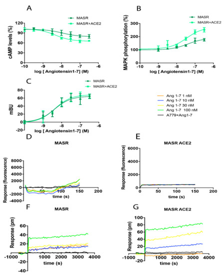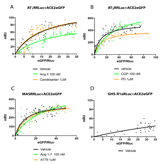 Finally, we addressed the possibility of physical interactions between MasR and ACE2. BRET assays confirmed these interactions. However, we observed no responses to treatment with MasR agonists or antagonists (Figure 4C). Parameters defining this interaction were: BRETmax = 362 ± 21 mBU and BRET50 = 10 ± 2 in the absence of receptor activation, BRETmax = 420 ± 60 mBU and BRET50 = 16 ± 5 in cells treated with receptor agonist, and BRETmax = 370 ± 40 mBU and BRET50 = 12 ± 4 in cells treated with receptor antagonist. A non-specific linear signal was obtained in HEK-293T cells that were transfected with the cDNA encoding GHS-R1a-RLuc (negative control) together with increasing amounts of ACE2-eGFP (Figure 4D).