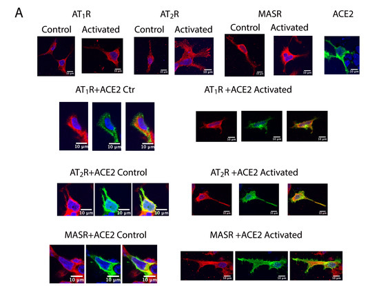 Taken together, our results indicate that ligand-mediated activation of AT1R resulted in diminished cell surface expression of ACE2. By contrast, activation of AT2R resulted in elevated levels of ACE2. No differential expression of this enzyme was observed in response to activation of MasR.