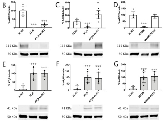 To determine levels of immunoreactive AT1R, AT2R, MasR, and ACE2-HA expression in transfected HEK-293T cells, equivalent amounts of cell protein (10 μg) were separated by denaturing 10% sodium dodecyl sulfate (SDS)-polyacrylamide gel electrophoresis (PAGE) and transferred onto polyvinylidene difluoride (PVDF)-fluorescence membranes. Membranes were treated overnight at 4 °C with a mixture of a mouse anti-β-tubulin antibody (1:2000; Sigma-Aldrich), a rabbit anti-ACE2 antibody (1:1000; Cat# ab108252, RRID:AB_10864415, Abcam, Cambridge, UK) and a mouse monoclonal anti-AT1R antibody (1:1000; Cat# sc-515884, RRID:AB_2801404, Santa Cruz Biotechnology, Dallas, TX, USA), a rabbit monoclonal anti-AT2R antibody (1:1000; Cat# ab92445, RRID:AB_10561969, Abcam, Cambridge, UK) and a mouse monoclonal anti-MasR antibody (1:1000; Cat# sc-390453, RRID:AB_2801406, Santa Cruz Biotechnology). Cells were subsequently treated with a mixture of IRDye 800-conjugated anti-mouse antibody (1:10,000; #A9044 from Sigma-Aldrich) and IRDye 680-conjugated anti-rabbit antibody (1:10,000; #926-68071 from LICOR Biosciences, Lincoln, NE, USA) for 2 h at room temperature. Bands were scanned using the Odyssey infrared scanner (LI-COR Biotechnology, Lincoln, NE, USA). Band densities were quantified using the scanner software and receptor level was normalized for differences in loading via normalization to tubulin protein band intensities.