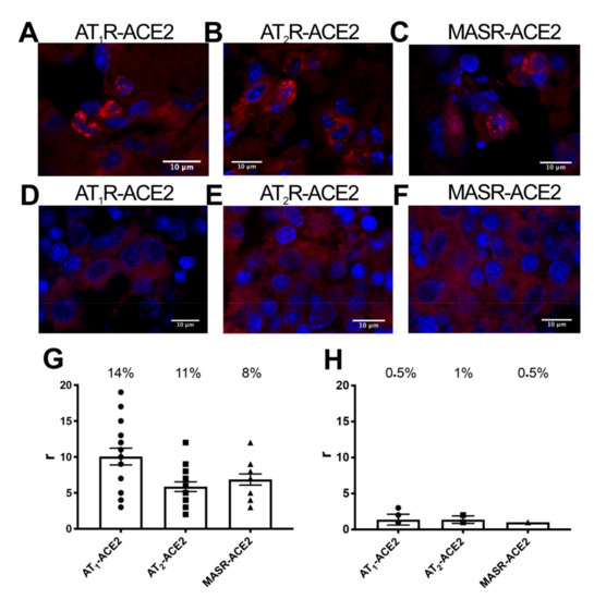 Using specific antibodies raised against the proteins of interest, we could detect that 14% of cells expressed AT1R-ACE2 complexes with around 10 red dots/cell-expressing dots (Figure 6A), 11% of cells expressed AT2R-ACE2 complexes with around 6 red dots/cell-expressing dots (Figure 6B) and that only 8% of cells expressed MasR-ACE2 complexes with around 7 red dots/cell-expressing dots (Figure 6C). These results demonstrate the existence of AT1R-ACE2, AT2R-ACE2 and MasR-ACE2 complexes in the adult lung of mice (Figure 6G). Remarkably, no positive signals were observed for any pair of proteins in sections from fetuses (<1% of cells displayed red clusters) (Figure 6D–F,H).