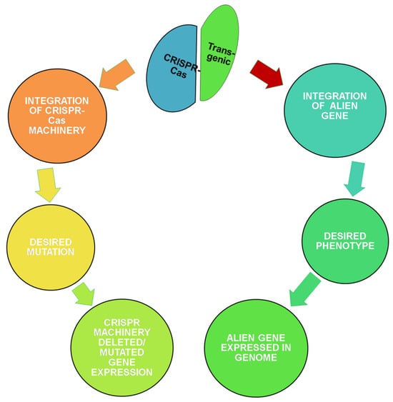 Illustration of CRISPR-Cas versus transgenic methodology and outcomes.
