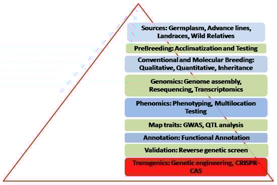 Pre-breeding activities in mobilizing novel alleles for cultivar development from wild relatives have been routinely involved in breeding programs [47]. Pre-breeding includes all activities directed at the identification of attractive crop traits including genes, as well as the consequent transfer of theirs into an excellent set of parents for extra choice [48]. The procedure identifies helpful characteristic(s) or maybe genes that could be exploited in cultivar growth. For vegetable legumes improvement, enough genetic diversity is present in wild relatives and landraces, which carry several helpful genes for cultivar improvement [49]. Pre-breeding activities must be initiated to produce new genetic variability using wild relatives and promising landraces for usage by the breeders in crop advancement programs. Pre-breeding must concentrate on the constant source of significant variability into the breeding pipeline to build new high yielding cultivars with a broad genetic base [50]. Though pre-breeding is helpful to enrich the primary gene pool for cultivar improvement, it is a time-consuming and challenging affair also. In this direction, linkage drag associated with wild relatives can make the pre-breeding tasks far more troublesome. Genomic-assisted pre-breeding is going to help to conquer the linkage drag and can facilitate the focused transfer of valuable genes/segments from wild relatives [51]. Therefore, it is important to understand all the above-mentioned factors for pre-breeding to exploit the available genetic variability for developing improved cultivars with a broad genetic base in vegetable legumes.