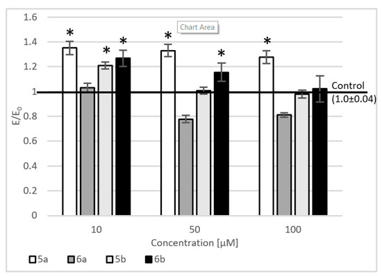 | 5a | 50 | −34.2 (0.06) * | −5.9 (0.02) | −47 (0.08) * |