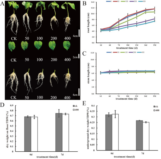 Effects of different concentrations of AlCl3 stress. (A) The comparison of plant, leaf, and root traits of 0 μM (CK), 50 μM, 100 μM, 200 μM, and 400 μM AlCl3 treatment for 24days. (B) Changing trend of root length under different concentrations of AlCl3 stress. (C) Changing trend of plant height under different concentrations of AlCl3 stress. (D) Changes of aboveground biomass under AlCl3 treatment for 0 days and 7 days. (E) Changes of belowground biomass under AlCl3 treatment for 0 days and 7 days. Results are mean ± SD of three biological replicates. ck-control. 0–0 μM/L, 50–50 μM/L, 100–100 μM/L, 200–200 μM/L, 400–400 μM/L.