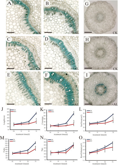 To explore the effects of aluminum stress on N. cadamba growth, the cross section of the third node of the stem and 1 cm root tip of plants were examined. The secondary xylem of third node treated with 400 μM AlCl3 for 1 day, 3 days, and 7 days (Figure 2B,D,F) was thicker than that of the control plantlets (Figure 2A,C,E). At the same time, there was no obvious change in the secondary xylem of control roots between 0 days and 7th day (Figure 2G,H); however, the secondary xylem of the root tip was thickened on 7th day after 400 μM AlCl3 treatment (Figure 2I). This suggested that aluminum stress could increase the secondary xylem thickening of stem and root.