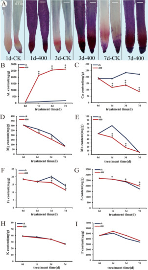 Absorption and distribution of aluminum by root tip. (A) Distribution of aluminum in root tip in different periods; the length of the root tip is 1 cm. Eriochrome cyanine R staining does not show red and brown as the control group, but shows red and blue as the treatment group. (B-I) Changes of element concentration in root tip. The error line represents the average ± SD of the three organisms (Students’ t-test, * p < 0.05, ** p < 0.01).