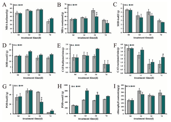 Effects of aluminum stress on ROS and chlorophyll. (A–H) Changes of ROS in leaves and root tips. (I) Chlorophyll content change. The error line represents the average ± SD of the three organisms. The * above the column chart shows that the content of elements between the two samples was significant (Students’ t-test, * p < 0.05, ** p < 0.01).