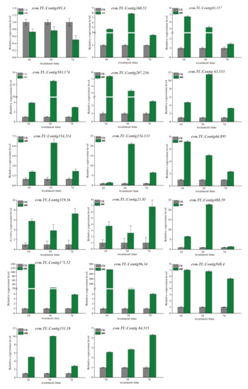 qRT-PCR verifies the relative expression levels of differential expression genes (DEGs) at different times under aluminum stress. Transport (evm.TU.Contig488.39, evm.TU.Contig519.36, evm.TU.Contig154.214, evm.TU.Contig154.133, evm.TU.Contig491.4, evm.TU.Contig63.553); transcription factor (evm.TU.Contig96.34, evm.TU.Contig948.4, evm.TU.Contig151.18, evm.TU.Contig84.515); protein (evm.TU.Contig368.51, evm.TU.Contig81.157, evm.TU.Contig 171.52, evm.TU.Contig583.176, evm.TU.Contig207.236, evm.TU.Contig66.895, evm.TU.Contig 21.81).