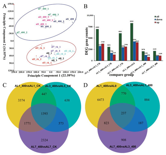 The DEGs of N.cadamba in response to aluminum stress. (A) Principal component analysis (PCA) of DEGs: diagram of treatment group and control group at 0 days, 1 day, 3 days, 7 days, the dots with the same color represent 3 biological replicates of the same treatment group, the blue area and the red area are the treatment group and control group gene cluster, respectively. (B) The green bar represents all DEGs, downregulated DEGs are in blue, and upregulated DEGs are in red, FDR < 0.05. (C,D) The overlapping area represents the DEGs with a common regulation mode between different treatments.
