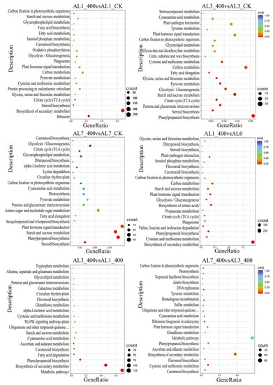 To explore the mechanism of aluminum stress on N. cadamba at different times, genes from twenty-one libraries were assembled and six groups were compared (AL1_400 vs. AL1_CK, AL3_400 vs. AL3_CK, AL7_400 vs. AL7_CK, AL1_400 vs. AL0, AL3_400 vs. AL1_400, and AL7_400 vs. AL3_400). The volcanic map was established to determine the overall distribution of DEGs in response to aluminum stress at different time Figure S2, and, evaluated from the difference multiple and significant level, the result shows that a total 77,705 DEGs was selected from the six groups of comparison combinations, and the number of DEGs in the three horizontal comparison combinations of AL1_400 vs. AL1_CK, AL3_400 vs. AL3_CK, and AL7_400 vs. AL7_CK was much greater than that of the three vertical comparison combinations of AL1_400 vs. AL0, AL3_400 vs. AL1_400, and AL7_400 vs. AL3_400.