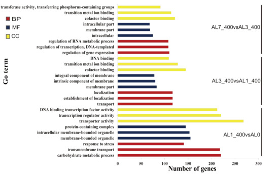 On the other hand, we also compared the three combinations of AL1_400 vs. AL0, AL3_400 vs. AL1_400, and AL7_400 vs. AL3_400 longitudinally to analyze the gene function clustering of N. cadamba after aluminum stress. We found that the key GO terms (Figure 8) enriched in the biological process include transmembrane transport (GO:0055085), transport (GO:0006810), response to stress (GO:0006950), etc. The molecular functions were mainly enriched in the cofactor binding, transition metal ion binding (GO:0048037, GO:0046914), and transcriptional regulation (GO:0016772, GO:0140110, GO:0003700). The cellular components were mainly enriched in membrane function (GO:0043231, GO:0044425, GO:0031224, GO:0016021, GO:0043227). The results revealed that there were significant differences in transcriptional regulation, metabolic processes, transport processes, and membrane functions induced by aluminum stress in different periods, which further indicated that the effects of aluminum stress on N. cadamba was significantly differed over time.