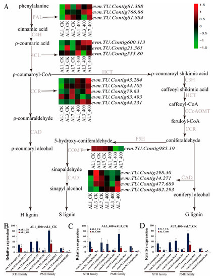 The cell wall is the most important site of aluminum accumulation in Al stress. Al stress results in an increase in the lignin content. According to the RNA-seq data, the expression of 16 DEGs genes involved in the synthesis of phenylalanine lignin monomer induced by aluminum stress was screened (Figure 9A). Several key enzymes involved in the synthesis of lignin monomer were upregulated at different stages after aluminum stress. For instance, the expression of genes similar to Arabidopsis thaliana PALA (evm.TU.Contig766.86), CCR1 (evm.TU.Contig45.284),CAD (evm.TU.Contig 462.293), and 4CL1 (evm.TU.Contig600.113) were significantly upregulated at 1 day, 3 days, and 7 days of aluminum stress. The proportion of upregulated genes involved in phenylalanine biosynthesis was higher in different periods, indicating that in N. cadamba root cell wall thickness and decreased cell wall malleability were regulated by altered lignin synthesis during aluminum stress.