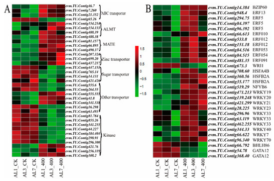 Expression of related transporters and transcription factors induced by aluminum stress. The threshold of FDR < 0.05, |log2 (FoldChange)| > 1 was used to screen the changes of differential gene expression between the treated group and the control group after aluminum stress at different times. (A) Heat map of aluminum transport-related gene and related protein kinase expression induced by aluminum stress. (B) Heat map of transcription factor-related gene expression induced by aluminum stress.
