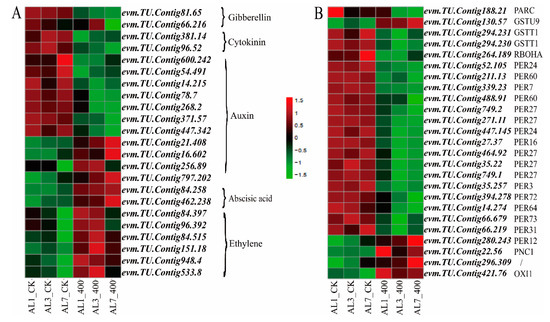 Comparative analysis with Arabidopsis thaliana genes showed that the relative expression of DEGs in the three combinations of AL1_400 vs. AL0, AL3_400 vs. AL1_400, and AL7_400 vs. AL3_400 (Figure S5), the expression of DEGs in different periods of aluminum stress was mainly downregulated by unknown functional gene evm.TU.Contig491.32 acting on the membrane, unknown functional gene evm.TU.Contig477.376, and new gene novel.619 responding to stress. The main upregulated genes in different periods were transcription factor NAC090 (evm.TU.Contig488.87), kinase evm.TU.Contig108.3, and enzyme FRO2 (evm.TU.Contig477.127), which can participate in heavy metal transport gene HIPP26 (evm.TU.Contig262.36), and some unknown functional genes were also upregulated.