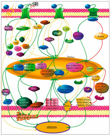 Al3+ is transported into cells either by the apoplastic or symplastic pathway and acts on organelles such as the nucleus, chloroplast, mitochondria, vacuoles, and lysosomes to induce aluminum tolerance genes, such as WRKY, MYB (v-myb avian myeloblastosis viral oncogene homolog), and bZIP (endosperm-specific basic Leu zipper) family genes, and induce transcription factors such as ERF (ethylene-responsive element binding factors), HSF (heat shock transcription factor), ARF (auxin response factor), NF-Y (nuclear factor Y), and the NAC (NAM, ATAF, and CUC) family [46,47,48,49], thus regulating their downstream gene expression [50]. For example, oxidative signal inducible 1 (OXI1) kinase mediates oxidative burst signal transduction to diverse downstream responses [51], glutathione S-transferases (GST) expression in Arabidopsis thaliana in response to oxidative stress, etc. [52]. Ferric chelate reductase 2 (FRO2) is an enzyme mediating the accumulation of reactive oxygen species [53]. In addition, NAC transcription factors are mainly involved in the process of senescence and apoptosis controlled by time evolutionary networks, and ANAC090 with ANAC017 plays a major regulatory role in salicylic acid SA and reactive oxygen species (ROS) responses [54,55]. Plants exposed to aluminum stress experience changes in the activities of superoxide dismutase (SOD), catalase from micrococcus lysodeiktic (CAT), malondialdehyde (MDA), peroxidase (POD), and other enzymes [16,20,56], which are closely related to the expression of genes involved in oxidative stress regulation. Some studies have shown that auxin influx OsAUX3-2 regulates root development [57], AtPIN3-shaped external current carriers mediate the transport of auxin [58,59], while the overexpression of OsPIN2, an auxin transporter gene, can reduce the production of aluminum-activated ROS [60]. HSF responds to abiotic stress as stress-induced and DNA-binding transcription factors. ERF is an ethylene-responsive factor involved in the regulation of plant hormones proteins regulate peroxidase [61]; the expression of these genes may be regulators of plant response to abiotic stress