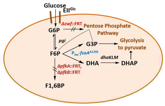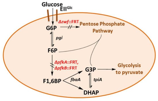 - Fraenkel, D.G. Glycolysis. In Escherichia coli and Salmonella: Cellular and Molecular Biology, 2nd ed.; Neidhardt, F.C.M., Curtiss, R., III, Ingraham, J.L., Lin, E.C.C., Low, K.B., Magasanik, B., Reznikoff, W.S., Riley, M., Schaechter, M., Umbarger, H.E., Eds.; ASM Press: Washington, DC, USA, 1996; pp. 189–198. [Google Scholar]