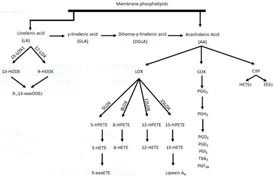 Polyunsaturated fatty acids (PUFAs) are divided into omega-3 (n-3) fractions (with the main synthesis pathway from α-linolenic acid) and omega-6 (n-6), which is synthesized from linoleic acid (LA) [7]. Linoleic acid can be metabolized to n-6 via desaturase, resulting via the biosynthesis of gamma-linolenic acid (GLA), dihomo-gamma-linolenic acid (DGLA), and finally AA [4]. The largest amount of arachidonic acid (AA), however, is found in phospholipid membranes, competing with n-3 acids for metabolism and with their products for receptors [4,5].