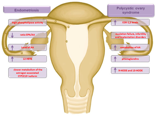 Polycystic ovary syndrome (PCOS) is one of the most common endocrinopathic complications for women of childbearing potential. The disease is multifactorial and is often associated with generalized body inflammation, and thus an increased risk of infertility, insulin resistance (IR), and obesity, as well as cardiovascular disorders [22]. It has been demonstrated that abnormal COX-2 levels are associated with ovulation failure, infertility, and implantation disorders [23]. In a rat model study, it was shown that the levels of PG and metabolites of AA (via the COX pathway) were significantly higher in the ovarian tissue of the PCOS group than in that of the healthy control group [24]. In turn, human studies have shown a significant increase in the 9-HODE/13-HODE serum level among patients with PCOS [25].