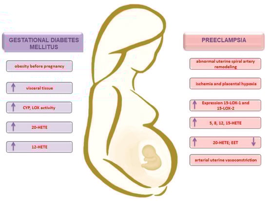 Obesity before pregnancy presents a predisposition to gestational diabetes mellitus (GDM) [56]. GDM is one of the most common complications during pregnancy. It is estimated that GDM affects as many as 18% of women in the world population. Many factors contribute to its occurrence, e.g., excessive body weight, age of the mother and her diet [57]. GDM is defined as abnormal carbohydrate tolerance detected for the first time during pregnancy, which normalizes after birth [58]. Excessive body weight is characterized by an increase in the amount of proinflammatory oxylipids, which in turn leads to the formation of chronic inflammation state [56]. When compared to normal body weight patients, obese patients show a higher concentration of metabolites such as 5- and 15-HETE [59]. It has also been suggested that obesity may adversely affect the fetal lipid profile, especially in the late stage of pregnancy and may be related with other pathologies during pregnancy [60]. An increase in the amount of CYP epoxygenase products, i.e., 9-, 10-, 12-, and 13-epoxyctadecenoic acid, has been observed as well [59]. Another study has shown a higher concentration of 20-HETE in the sera of obese women compared to a group with a normal body weight. Strong adipogenic 20-HETE activity has also been observed [61]. Another study has demonstrated an increased 20-HETE concentration in both the urine and plasma of a group of patients with metabolic syndrome, compared to a control group [62].