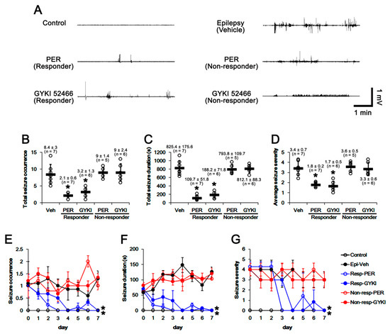 The effects of perampanel (PER) and GYKI 52,466 (GYKI) on spontaneous seizure activities in chronic epilepsy rats. Both α-amino-3-hydroxy-5-methylisoxazole-4-propionic acid receptor (AMPAR) antagonists effectively attenuate spontaneous seizure activities in responders. (A) representative electroencephalograms (EEG) in each group at two days after treatment. (B–D) Quantitative analyses of total seizure occurrence (B), total seizure duration (C) and average behavioral seizure score (seizure severity, D) in a seven-day period. Open circles indicate each individual value. Horizontal bars indicate mean value. Error bars indicate SD (* p < 0.05 vs. vehicle (Veh)-treated animals; Mann Whitney U-test for total seizure occurrence and average seizure severity; Student t-test for total seizure duration). (E–G) Quantitative analyses of the chronological effects of AMPAR antagonists on seizure occurrence (E), seizure duration (F), and seizure severity (G) over a seven-day period. Error bars indicate SD (* p < 0.05 vs. vehicle (Veh)-treated animals; Friedman test for seizure occurrence and seizure severity; repeated measures ANOVA for seizure duration).