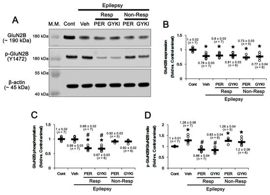 The effects of perampanel (PER) and GYKI 52,466 (GYKI) on total glutamate ionotropic receptor NMDA type subunit 2B (GluN2B) expression and its tyrosine (Y) 1472 phosphorylation (p-GluN2B) in chronic epilepsy rats. (A) Representative images for Western blot of GluN2B and GluN2B Y1472 levels in the hippocampal tissues. (B–D) Quantifications of GluN2B (B), p-GluN2B (C), and p-GluN2B/GluN2B ratio (D) in the hippocampal tissues. Open circles indicate each individual value. Horizontal bars indicate mean value. Error bars indicate SEM (*, # p < 0.05 vs. control and vehicle (Veh)-treated animals, respectively; one-way ANOVA with post hoc Bonferroni’s multiple comparison).