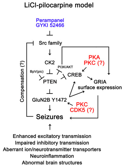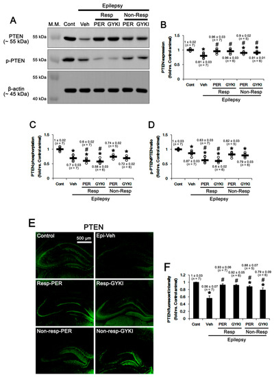 - Kim, J.E.; Park, H.; Lee, J.E.; Kim, T.H.; Kang, T.C. PTEN is required for the anti-epileptic effects of AMPA receptor antagonists in chronic epileptic rats. Int. J. Mol. Sci. 2020, 21, 5643. [Google Scholar] [CrossRef]