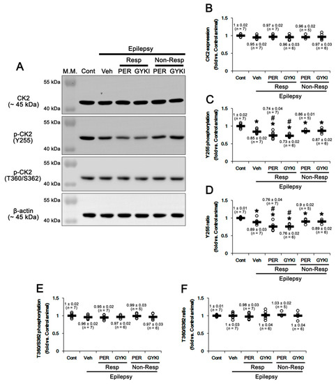 The effects of perampanel (PER) and GYKI 52,466 (GYKI) on total casein kinase 2 (CK2) and its Y255 and T360/S362 phosphorylations in chronic epilepsy rats. Both AMPAR antagonists reduce only CK2 Y255 phosphorylation in responders (Resp), but not non-responders (Non-Resp). (A) Representative images for Western blot of CK2 and p-CK2 levels in the hippocampal tissues. (B–F) Quantifications of CK2 (B), p-CK2 Y255 (C), p-CK2 Y255/CK2 ratio (D), p-CK2 T360/S362 (E), and p-CK2 T360/S362/CK2 ratio (F) levels in the hippocampal tissues. Open circles indicate each individual value. Horizontal bars indicate mean value. Error bars indicate SEM (*, # p < 0.05 vs. control and vehicle (Veh)-treated animals, respectively; one-way ANOVA with post hoc Bonferroni’s multiple comparison).