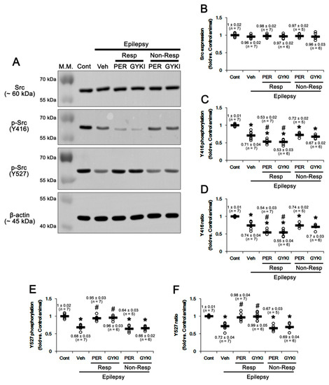 The Src family activities are reversely modulated by phosphorylation of two distinct tyrosine sites: Y416 autophosphorylation upregulates its kinase activity. In contrast, Y507 phosphorylation decreases its enzyme activity, although Y527 dephosphorylation is insufficient for full activation of Src [45,46]. Thus, we also investigated the effects of AMPAR antagonists on Src phosphorylations. Src protein level in the epileptic hippocampus was similar to that in the control, which was not influenced by AMPAR antagonists (F(5,32) = 0.4, p = 0.85, one-way ANOVA; Figure 5A,B, Figure S4). Src Y416 phosphorylation level was 0.71 ± 0.04-fold in the epileptic hippocampus than that in controls (t(12) = 6.7, p < 0.001 vs. control animals, Student t-test; Figure 5A,C, Figure S4) and its phosphorylation ratio was 0.74 ± 0.04-fold of control level (t(12) = 6.2, p < 0.001 vs. control animals, Student t-test; Figure 5A,D, Figure S4). In responders, perampanel and GYKI 52,466 decreased Src Y416 phosphorylation level to 0.53 ± 0.02 and 0.53 ± 0.03-fold of control level, respectively (F(2,17) = 10.3, p = 0.001 vs. vehicle, one-way ANOVA; Figure 5A,C, Figure S4). Both AMPAR antagonists reduced Y416 phosphorylation ratios to 0.54 ± 0.03 and 0.55 ± 0.04-fold of control level, respectively (F(2,17) = 10.0, p = 0.001 vs. vehicle, one-way ANOVA; Figure 5A,D, Figure S4). In non-responders, perampanel and GYKI 52,466 did not affect Y416 phosphorylation level (F(2,15) = 0.6, p = 0.56 vs. vehicle, one-way ANOVA; Figure 5A,C, Figure S4) and its ratio (F(2,15) = 0.4, p = 0.67, one-way ANOVA; Figure 5A,D, Figure S4).