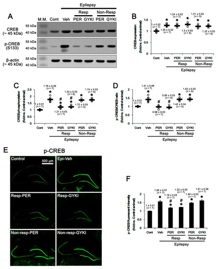 The effects of perampanel (PER) and GYKI 52,466 (GYKI) on total Ca2+/cAMP response element-binding protein (CREB) and its S133 phosphorylation in chronic epilepsy rats. Both AMPAR antagonists reduce CREB S133 phosphorylation in responders (Resp), but not non-responders (Non-Resp). (A) Representative images for Western blot of CREB and p-CREB levels in the hippocampal tissues. (B–F) Quantifications of CREB (B), p-CREB S133 (C), and p-CREB S133 ratio (D) levels in the hippocampal tissues. Open circles indicate each individual value. Horizontal bars indicate mean value. Error bars indicate SEM (*, # p < 0.05 vs. control and vehicle (Veh)-treated animals, respectively; one-way ANOVA with post hoc Bonferroni’s multiple comparison).
