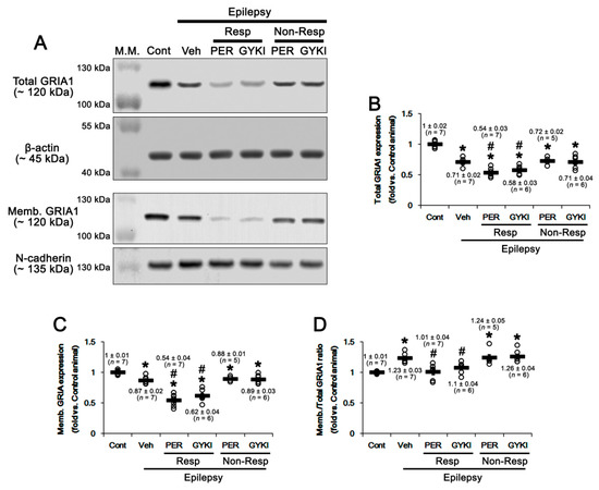 The effects of perampanel (PER) and GYKI 52,466 (GYKI) on total glutamate ionotropic receptor AMPA type subunit 1 (GRIA1) and its surface expression level in chronic epilepsy rats. Both AMPAR antagonists reduce total- and membrane GRIA1 expression in responders (Resp), but not non-responders (Non-Resp). (A) Representative images for Western blot of total- and membrane GRIA levels in the hippocampal tissues. (B–D) Quantifications of total GRIA1 (B), membrane GRIA1 (C), and membrane (memb.)/total GRIA1 ratio (D) levels in the hippocampal tissues. Open circles indicate each individual value. Horizontal bars indicate mean value. Error bars indicate SEM (*, # p < 0.05 vs. control and vehicle (Veh)-treated animals, respectively; one-way ANOVA with post hoc Bonferroni’s multiple comparison).