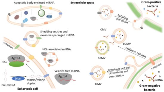 Modes of extracellular miRNA packaging in eukaryotic cells and routes leading to the formation of different membrane vesicle types in bacteria. Extracellular miRNAs can be cargo in membranous vesicles or can be vesicle free and associated with either Argonaute (Ago) proteins alone or incorporated into HDL particles. Apoptotic bodies, shedding vesicles, and exosomes are three types of membranous vesicles that contain these extracellular miRNAs. Apoptotic bodies can also contain various cellular organelles including mitochondria and nucleic acids [28]. In bacteria, distinct membrane vesicles are formed by Gram-negative and Gram-positive bacteria. Blebbing of the outer membrane and explosive cell lysis are the two main routes for vesicle formation in Gram-negative bacteria. The membrane vesicles from these bacteria can be divided into outer-inner membrane vesicles (OIMVs), explosive outer membrane vesicles (EOMVs), and traditional OMVs according to their formation routes, structures, and compositions [45]. In Gram-positive bacteria, membrane vesicles are formed by a mechanism involving the prophage-encoded endolysin that generates holes in the peptidoglycan cell wall, allowing the cytoplasmic membrane material to protrude into the extracellular space and release the cytoplasmic membrane vesicles (CMVs). CMVs can contain membrane and cytoplasmic components [46].