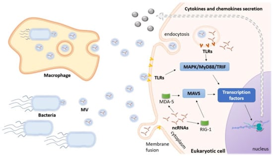 A study on sRNAs present in OMVs from the periodontal pathogens Aggregatibacter actinomycetemcomitans, Porphyromonas gingivalis, and Treponema denticola showed that, despite the different features, these three bacteria exhibit a similar pattern in terms of seRNAs, as it has been described for other Gram-negative bacteria [103]. msRNAs were found in OMVs, which therefore can penetrate host eukaryotic fibroblast cells (NIH3T3). However, the release of msRNAs inside host cells remains to be demonstrated. A combination of synthetic msRNA oligos, one from each mentioned periodontal pathogen, was transferred into Jurkat T cells and a decrease of the anti-inflammatory cytokines Interleukin (IL)–5, IL-13, and IL-15 was observed [103]. Further analyses are necessary to clarify the function of each msRNA. The work of Ho et al. (2015) corroborated the ability of P. gingivalis vesicles to invade host cells, showing that 70–90% of human primary oral epithelial cells, gingival fibroblasts, and human umbilical vein endothelial cells carried vesicles from P. gingivalis 33,277 after exposure for 1 h. Moreover, P. gingivalis vesicles, containing both DNA and RNA molecules, were found to be capable to transfer DNA between P. gingivalis strains, also displaying an inhibitory effect in the Streptococcus gordonii biofilm formation ability. These results evidence a major role of P. gingivalis vesicles on bacterial survival in the oral cavity, as well as on the induction of periodontitis, although the involvement of seRNAs on such regulatory mechanism remains to be proved [104]. Furthermore, Han et al. provided evidence for the cytoplasmic delivery and activity of A. actinomycetemcomitans OMV-derived small seRNAs in host gene regulation, finding an enhanced TNF-α production via TLR-8 and NF-κB signaling pathways [105]. In another study, Choi et al. reported the detection of msRNAs from the Gram-positive oral pathogen Streptococcus sanguinis in the host intracellular medium, being two of them also present on the S. sanguinis MVs [106]. Figure 2 illustrates the general processes of host cell immune response to EVs and its internal RNA content.