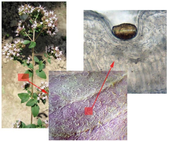 - Shafiee-Hajiabad, M.; Hardt, M.; Honermeier, B. Comparative Investigation about the Trichome Morphology of Common Oregano (Origanum vulgare L. Subsp. Vulgare) and Greek Oregano (Origanum vulgare L. Subsp. Hirtum). J. Appl. Res. Med. Aromat. Plants 2014, 1, 50–58. [Google Scholar] [CrossRef]